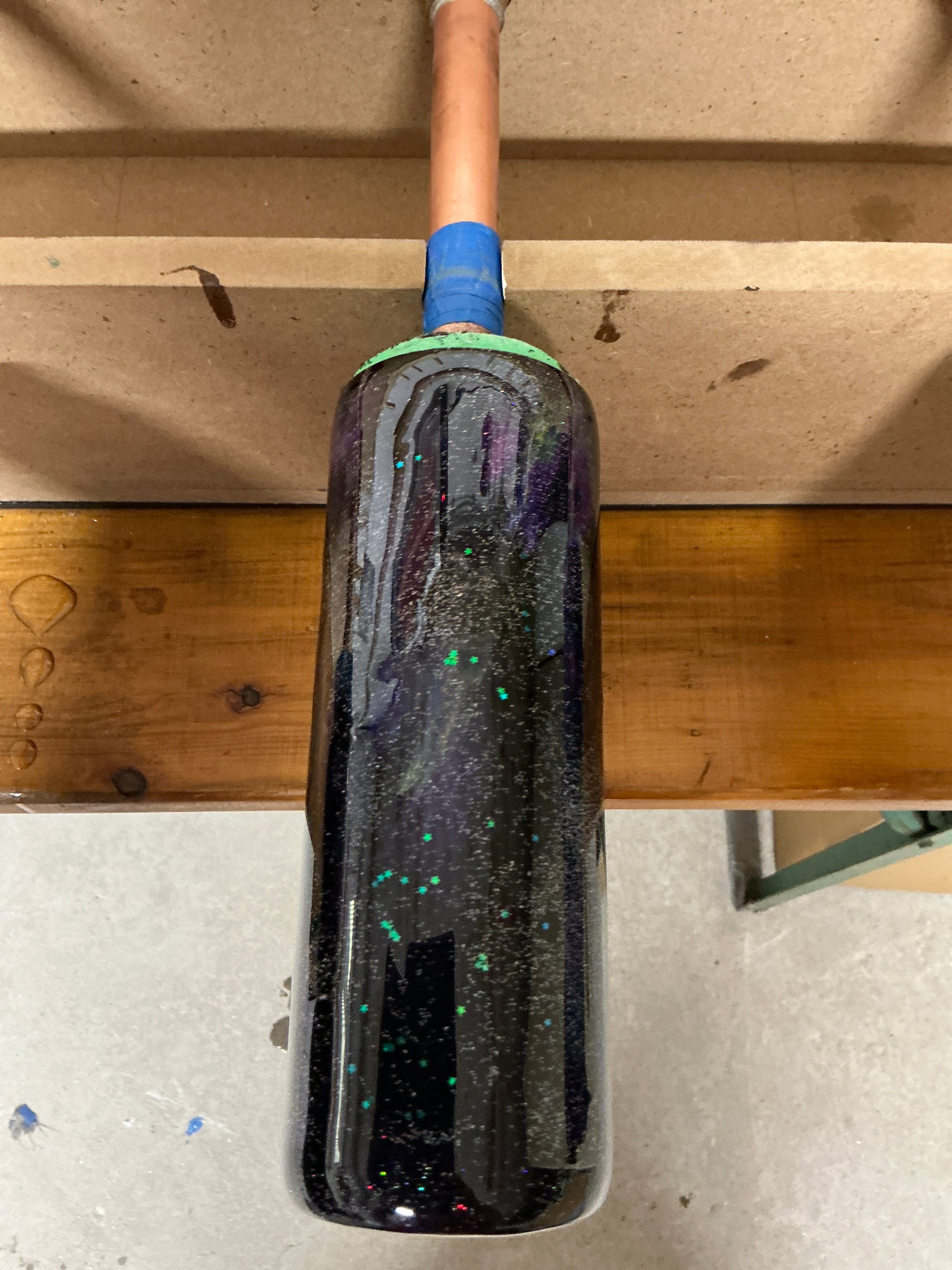Eine Personalisierung mit Namen; oder Schriftzug mittels Vinylfolie ist noch möglich, da noch eine Schicht Epoxidharz on top kommt.
